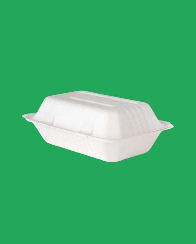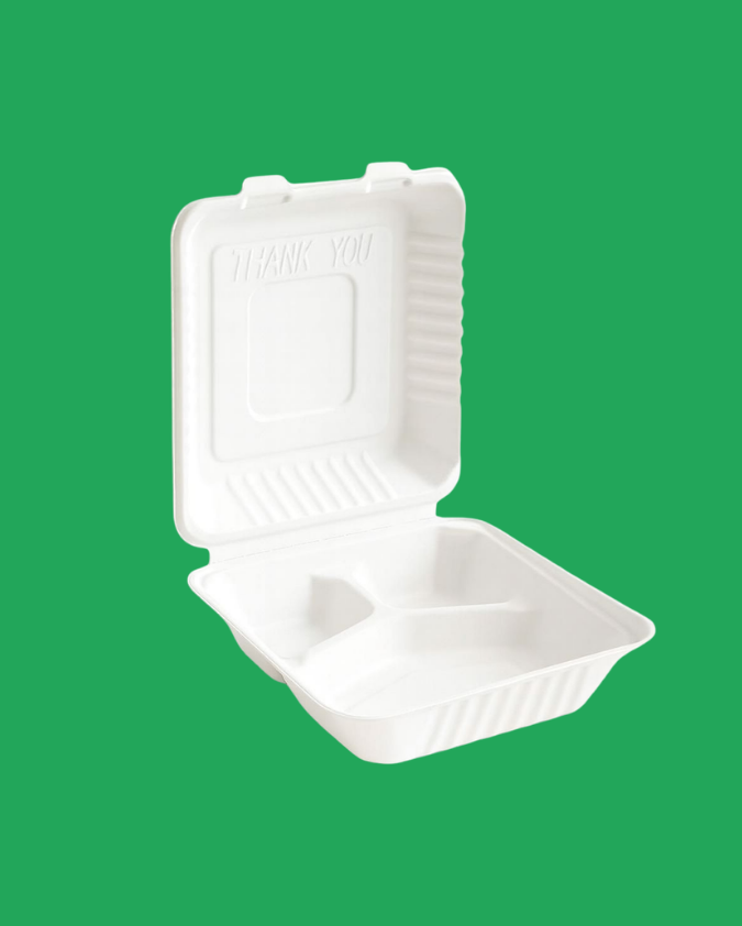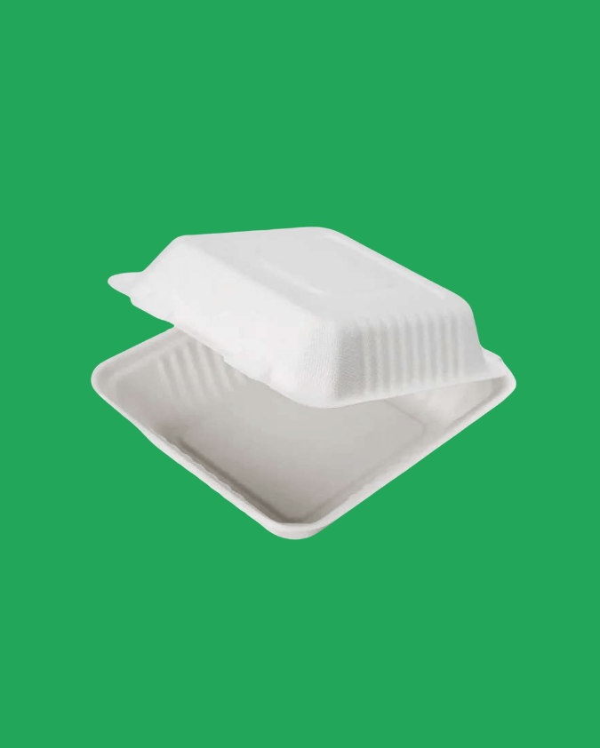 🍱 Product Type: Bagasse clamshell with 3 compartments📏 Size: 9 × 9 inches🌿 Material: Bagasse (sugarcane fibre)🍽️ Compartments: 3 sections for food separation🔥 Usage: Suitable for hot and cold foods📦 Quantity: 200 clamshells per carton✨ Finish: Natural, sturdy, and compostable design